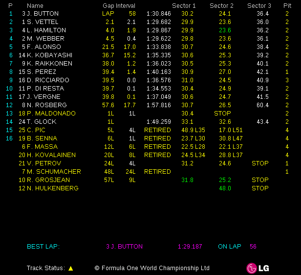 Jenson Button wins ahead of Sebastian Vettel and Lewis Hamilton. Kamui Kobayashi on 6th! Both Saubers in the top 10! Both Australian drivers in top 10. Kimi Raikkonen back in F1 with an impressive 7th.