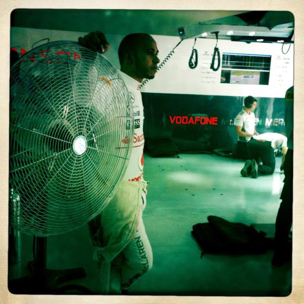 Lewis chilling out (literally!) in the garage during practice at the Sepang Circuit earlier today. It is HOT in Malaysia!