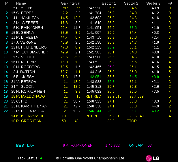 The Ferrari driver wins the Malaysian Grand Prix two seconds ahead of Sergio Perez in a very fast Sauber. Kimi Raikkonen fastest man on the track today.