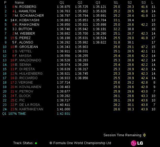 The first pole position ever for Nico Rosberg, who will be the 7th German driver to archieve a pole position in F1! Michael Schumacher goes to the press conference with Lewis Hamilton. Both Saubers in top 10! ***UPDATE: Michael Schumacher on P2. Clean Mercedes row 1! (Lewis Hamilton got a 5 place penalty for a gearbox change)***