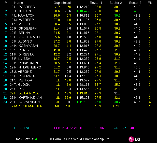 Overwhelming victory by the young Rosberg. Its a great day for the family. It has been a long time in the making, but it seems, that he is finally driving in a car that is fast enough to compete for victory, and theres probably more to come from this talented and hard working driver. The superiority of the victory has reminscents of the Mclaren victory in the Australian grand prix in 1998, in the sense that this will lead to further discussions about the new Mercedes front wing. Good job Mercedes, and welcome back in the game.