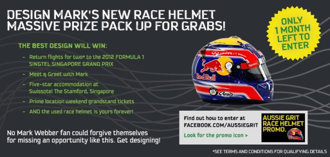 Have you entered the Aussie Grit Helmet Promo yet? Your chance to witness the 2012 Singapore Grand Prix and watch Mark race wearing a helmet that YOU designed! Download the templates today, only one month left to enter https://www.facebook.com/aussiegrit/app_213393335439316