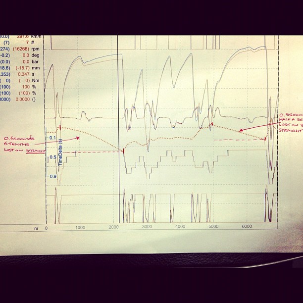 In engineering, just been shown this, overlay of mine & jensons qualifying lap on a speed trace.This is what I was trying to explain yesterday. The doted line is the time line. Downwards means I lose time to Jenson, up means I gain time.