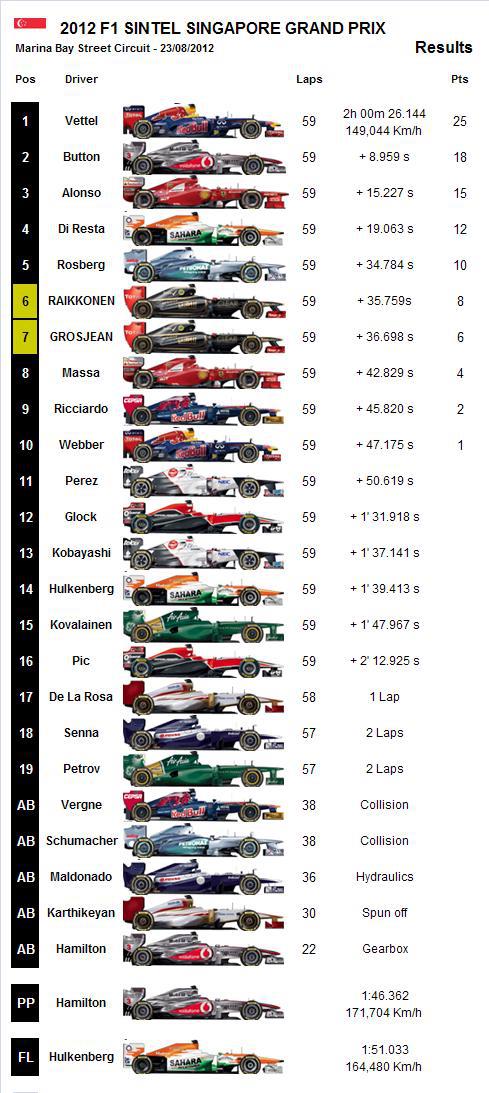 2012 F1 Singtel Singapore Grand Prix – Race Results