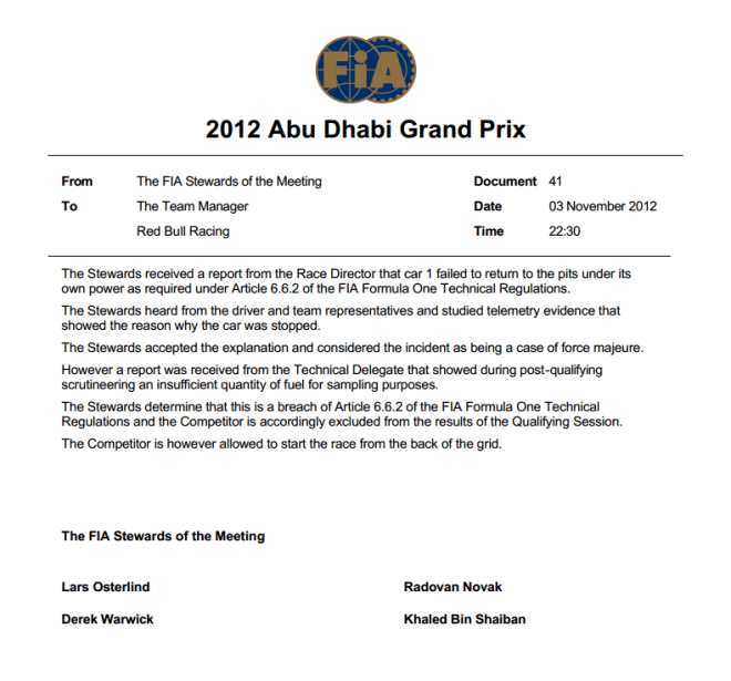 → 6.6.2 Competitors must ensure that a one litre sample of fuel may be taken from the car at any time during the Event. Except in cases of force majeure (accepted as such by the stewards of the meeting), if a sample of fuel is required after a practice session the car concerned must have first been driven back to the pits under its own power.