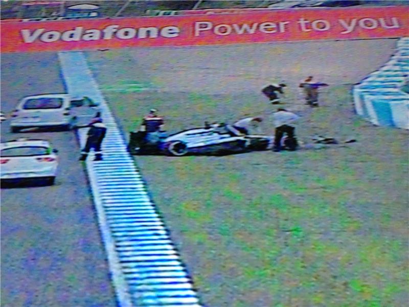 The Dane has gone off round the back of the circuit rounding the curved right-handed Turn 10 and judging by the CCTV camera shot he ran wide over the Astroturf and the gravel and dropped it from there. P