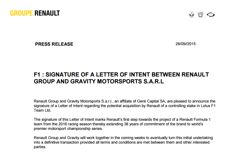 Breaking NewsRenault buys Lotus F1 Team Renault has signed a letter of intent to take controlling stake in the Lotus_F1 Team for the 2016 season. Please be social: Click to share on Flattr (Opens in new window) Flattr Click to share on Facebook (Opens in new window) Facebook Click to share on X (Opens in new window) X Click to share on Pinterest (Opens in new window) Pinterest Click to share on Tumblr (Opens in new window) Tumblr Click to share on LinkedIn (Opens in new window) LinkedIn Click to share on Reddit (Opens in new window) Reddit Like Loading... Published by Admin View all posts by Admin