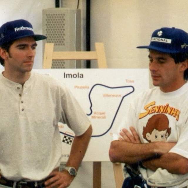 It is the San Marino (or Emilia-Romagna, as it now known) Grand Prix weekend. Better known simply as ‘Imola’. May 1st has passed, but its roughly close enough 30 years since this photo was taken on what was to be Ayrton’s last Sunday morning. We were at a sponsor function and we had lost Roland the day before so the mood was pretty heavy. I think we’d also already done the Driver briefing where Ayrton had asked me and Gerhard to challenge the FIA Race Director on the suitability of the Safety Car. He had a penalty hanging over him so he didn’t want to draw fire directly from the FIA by being the lone agitator. But he surely waded in after us to make his point clear. The Safety Car – an Opel Vectra – was sub-standard. The Safety car driver, Max Angelelli, had already complained about it, but they didn’t want to change the car for their own opaque reasons. Predictably, the ironically titled Safety Car came into play in the race. Ayrton pulled up along side the car gesticulating angrily for it to speed up. But it couldn’t. It was already at its, and its driver’s, limit. The rest is history.