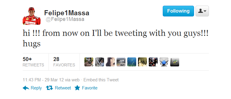 You can follow Felipe Massa on Twitter here. Sebastian Vettel is now the only driver not on Twitter.